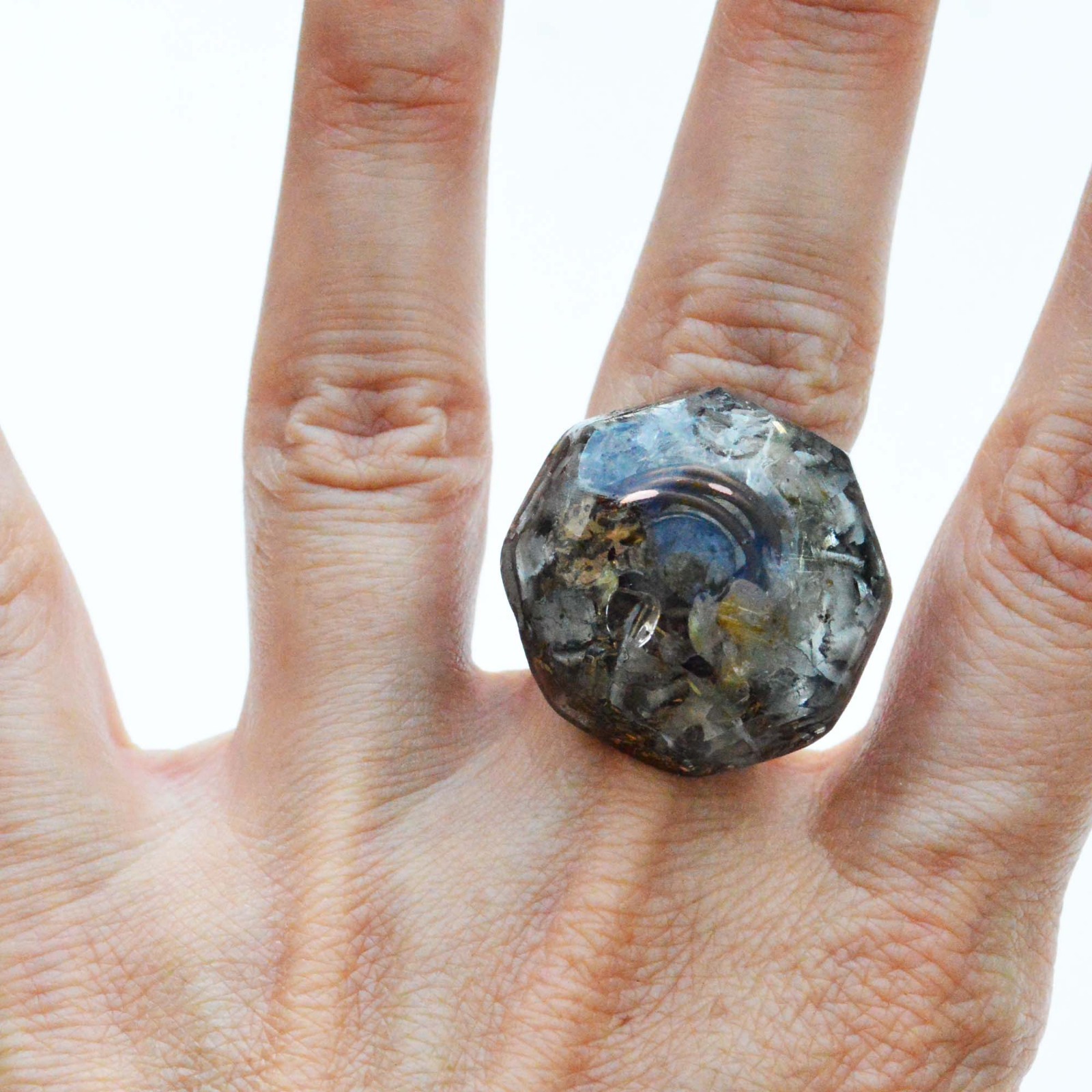 Los anillos de Amebaglam® están compuestos de resina de poliéster, metales y cristales cuidadosamente seleccionados.